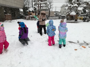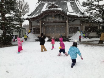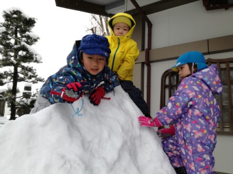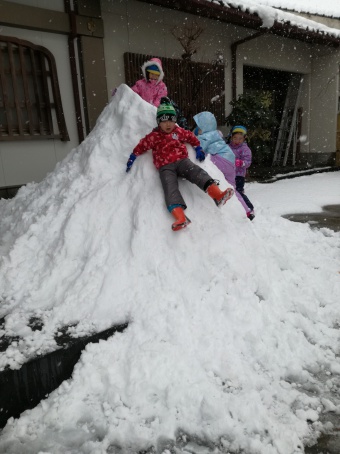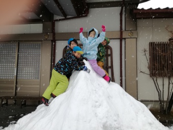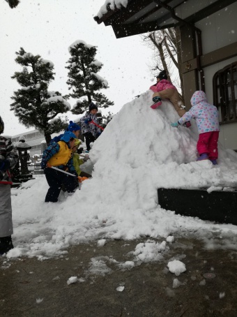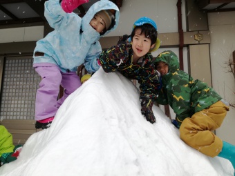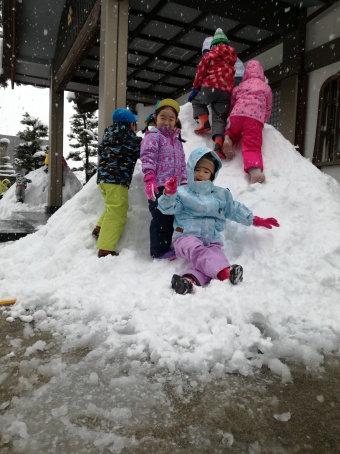 2022.01.13 立正キッズ日記 雪山サイコーヤッホー 立正幼稚園の自慢の雪山を見てください! 本堂の屋根から落ちた雪が大きな大きな山となって子供たちの格好の遊び場になります。もちろん屋根に雪があるときは危険なので遊べないのですが、先生のOKサインが出れば~~~それはそれは皆競うように登り、てっぺんでは必ず雄叫びをあげ(笑)そしてその後はいろんな格好で滑りおりるというルーティンになります。 さらに雪が積もれば、もっともっと大きくなるのですが、さて今年はどこまで大きくなるでしょうか。