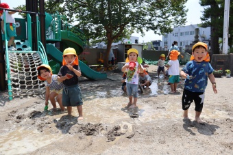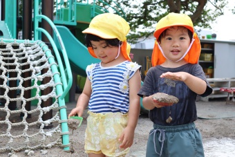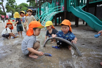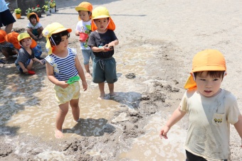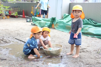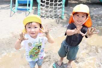 2022.06.20 立正キッズ日記 どろんこ遊び 2歳児さん この日泥遊びをしているのは、2歳児さんです。小さな可愛いお手てで泥をぺちゃぺちゃこねこね。何を作っているのかな?ホースに泥水を入れて遊んだり、スコップの上に泥を乗せて投げてみたり、さまざまな方法で泥の感触を楽しんでいました。