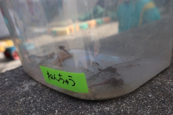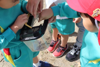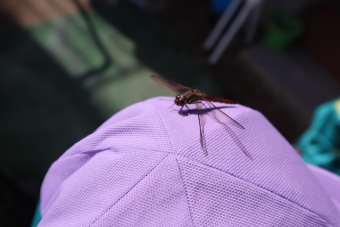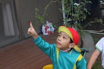 帽子の上にとまってるのを教えてもらったり、指の先にとまったとんぼを息をころして見入ったり、捕まえたとんぼを虫かごに入れて観察したり・・・。決められた時間の中で色んな遊びが交差していました。
