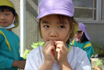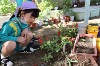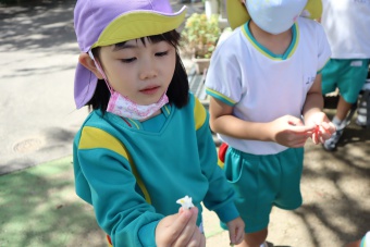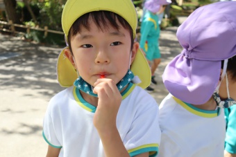 サルビアの赤い花の周りでは、花柄を口に含み、ちゅーちゅー。「あまーーい!」と初めて体験するサルビアの密の甘さにびっくり。