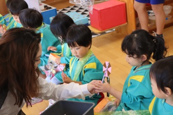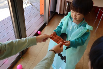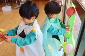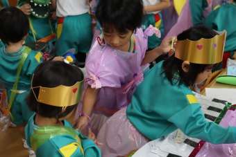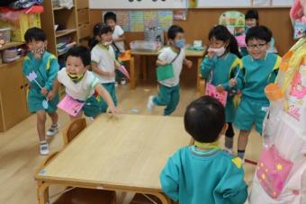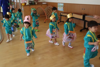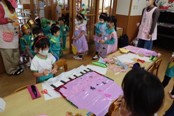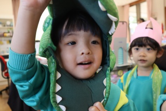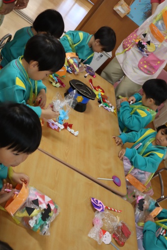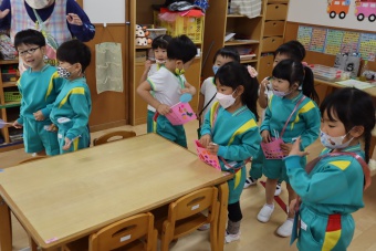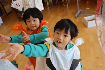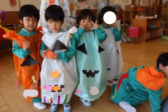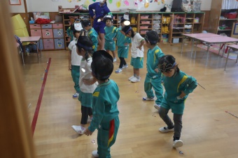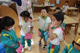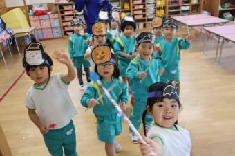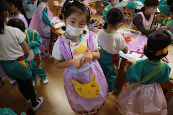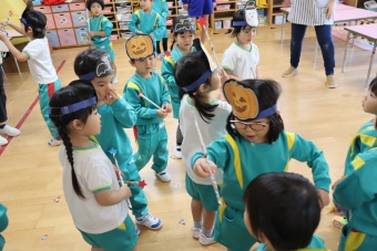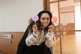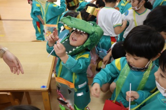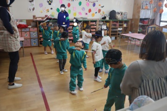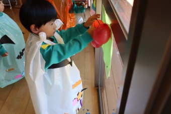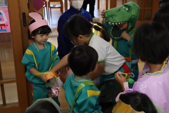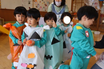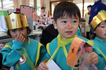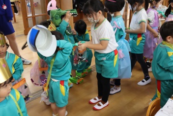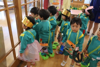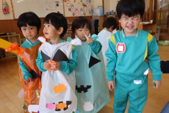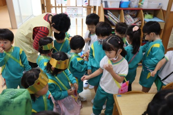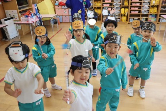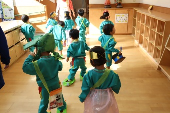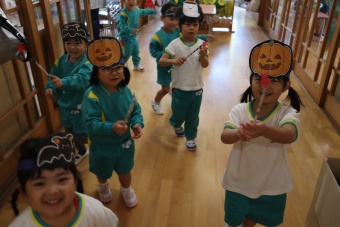 2022.10.31 立正キッズ日記 ハロウィーン 園内は大騒ぎ! 「お菓子くれないと、いたずらしちゃうぞー」園内に子供たちの可愛い声が響いています。 この日、2歳児ももぐものみんなは、ハロウィンの仮装に身をつつみ、幼稚園内の各クラスを渡り歩いています。 クラスで作戦会議をし、担任の先生と一緒にぞろぞろぞろ・・・。教室に入るときの決まり文句は、もちろん「お菓子くれないと、いたずらしちゃうぞー」 とにかく他のクラスの様子も一緒に、可愛い姿をご覧下さい~。