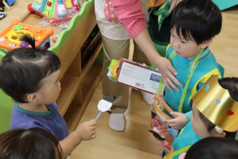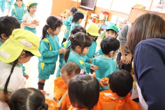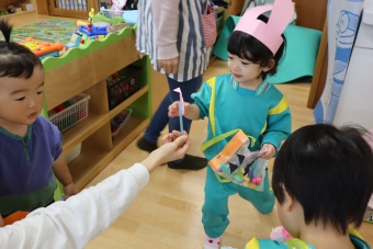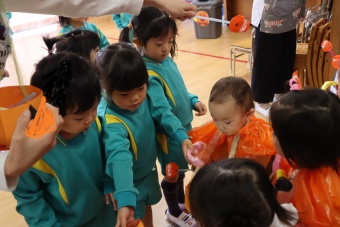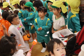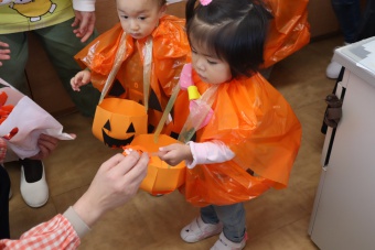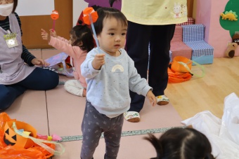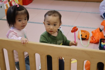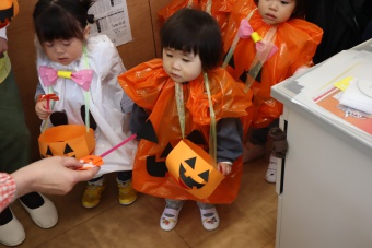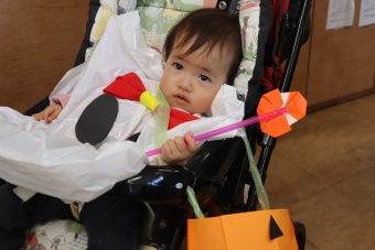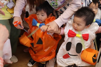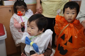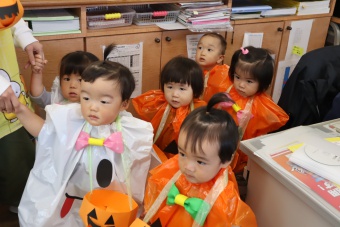2022.10.31 立正キッズ日記 0.1歳さん、ハッピーハロウィン!! 0,1才さんの仮装は、かわいいおばけ~ 子供たちはなんのことか分からないまま職員室に遊びに来てくれました。 楽しんでいるのは、子供たちより先生たちかも・・・笑 他のクラスに遊びに行ってもみんなに大歓迎でした。