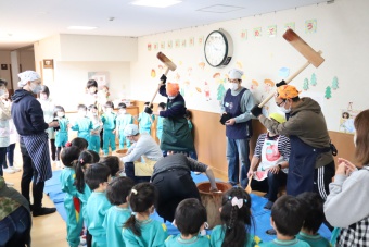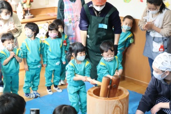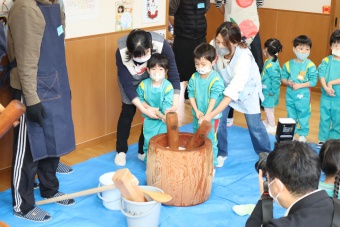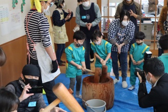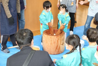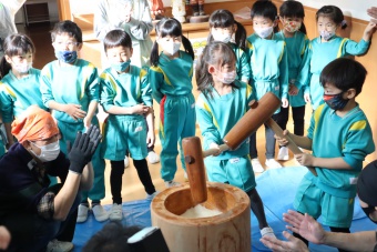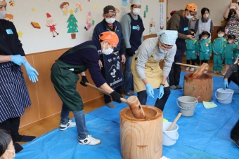 コロナ禍の中、3年ぶりに開催されたおもちつきは、お父さんお母さん方も加わり大変賑やかでした。