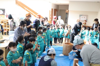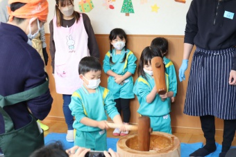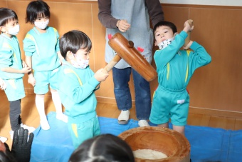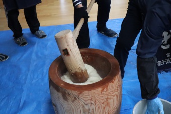 目の前では湯気のあがった真っ白なおもちがいい音をだしながらつかれ、その後子供たちは小さな杵を持ち、ぺったんぺったんと楽しい経験です。