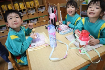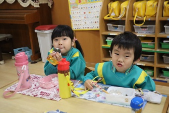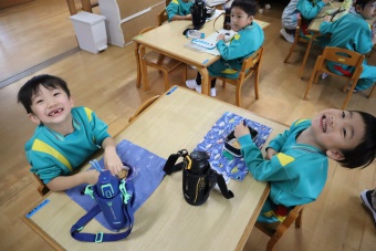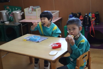 そんな中、 子供たちといえばいつもと違う園内の様子に、そして普段見慣れぬお父さんのエプロンと三角巾姿に目を丸くしています。