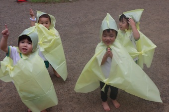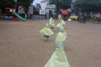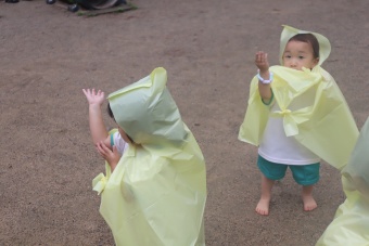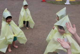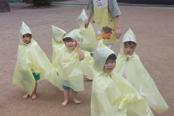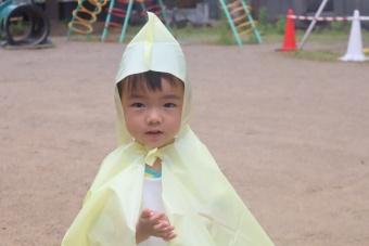 2023.07.03 立正キッズ日記 雨だ〜! 2歳児 雨だけどお外へ行こう!レインコートを着て遊ぶのも楽しいね! 雨の日の園庭はいつもと雰囲気が違って不思議。 フードをかぶって気分はてるてる坊主。明日は晴れるかな?
