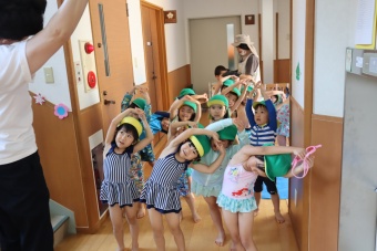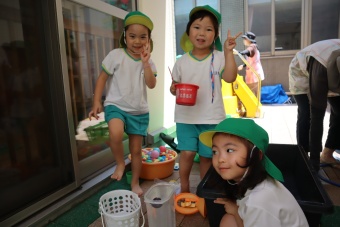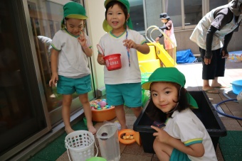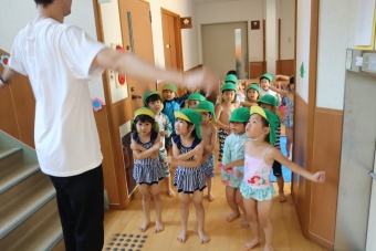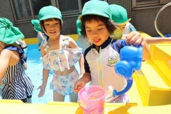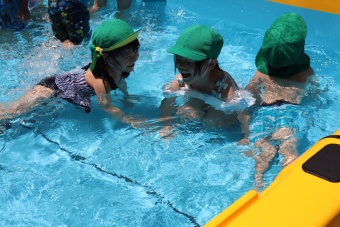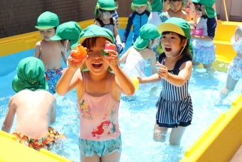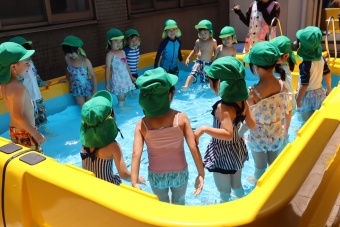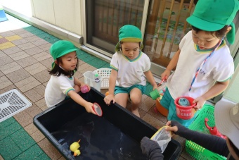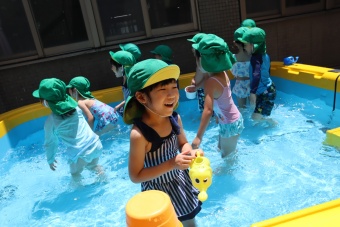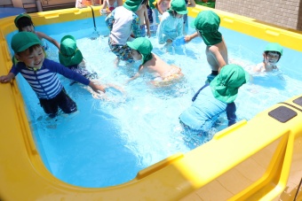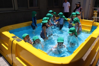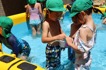 2023.07.04 立正キッズ日記 プール遊び 年中さん 年中さんも、年少さんに引き継いでプール遊びです。 準備体操もしっかり行い、いざ! 年中さんは年少さんと違い、体全部を水につけたりとダイナミックです。
